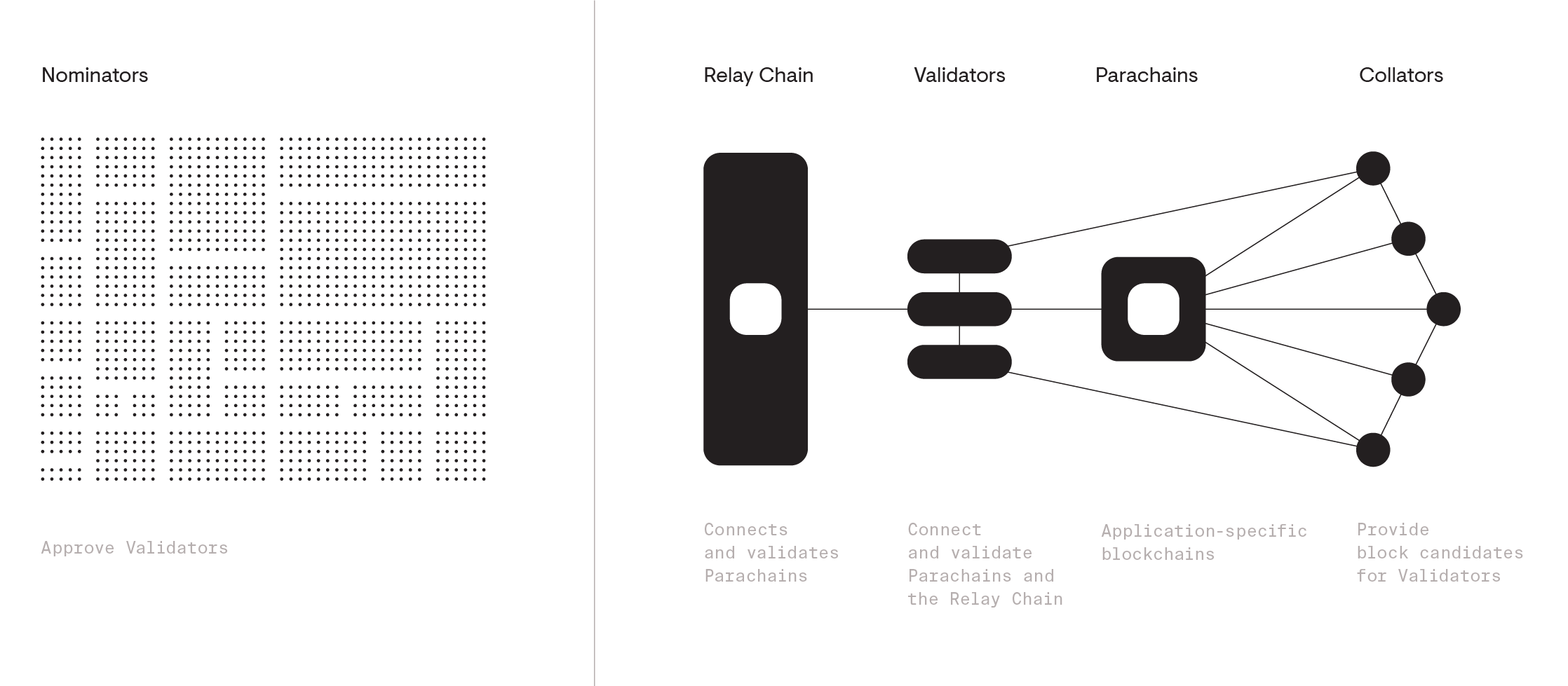 About once per day, the system elects a group of entities called validators, who in the next few hours will play a key role in highly sensitive protocols such as block production and the GRANDPA finality gadget. Their job is demanding as they need to run costly operations, ensure high communication responsiveness, and build a long-term reputation of reliability. They also must stake their DOTs, Polkadot’s native token, as a guarantee of good behavior, and this stake gets slashed whenever they deviate from their protocol. In contrast, they get paid well when they play by the rules. Any node that is up to the task can publicly offer itself as a validator candidate. However, for operational reasons only a limited number of validators can be elected, expected to be hundreds or thousands.