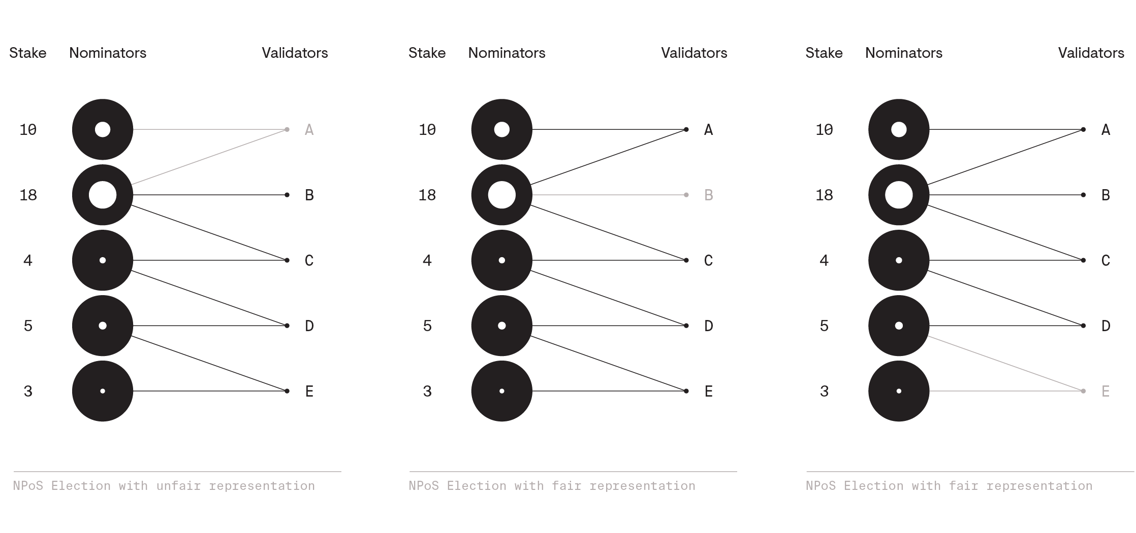 How to elect the validators, given the nominators’ votes? Unlike other PoS-based projects where validators are weighted by stake, Polkadot gives elected validators equal voting power in the consensus protocol. To reflect this fact, the nominators’ stake should be distributed among the elected validators as evenly as possible, while still respecting the nominators’ preferences. At the Web3 Foundation research team, we use tools ranging from election theory to game theory to discrete optimization, to develop an efficient election process that offers fair representation and security, and can be applied in the future to any blockchain using NPoS. We explore these objectives below, together with some examples.