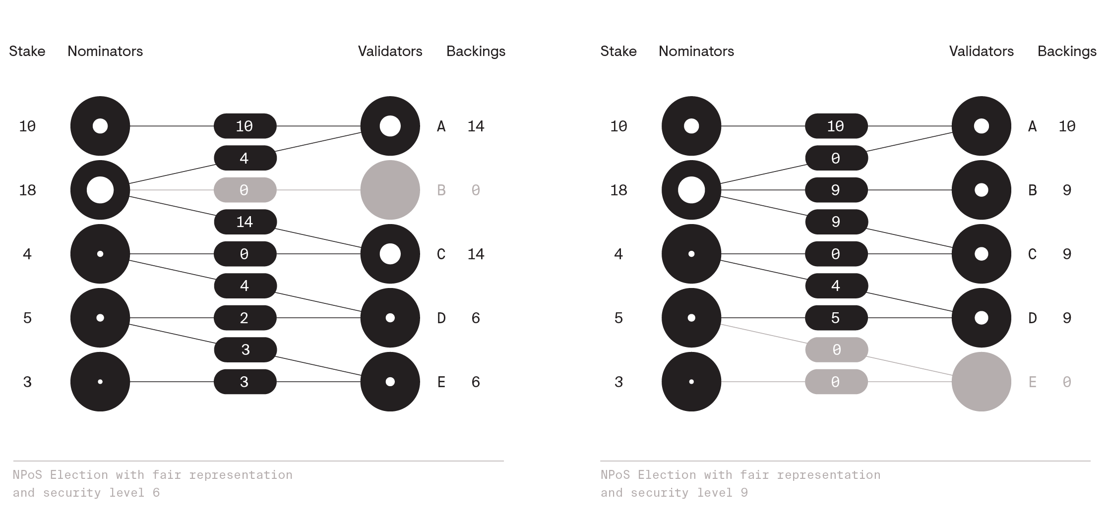 The election result on the right achieves a higher security level, and clearly does a better job at splitting the nominators’ stake into validators’ backings of roughly equal size. The goal of the NPoS election process is thus to provide a result that achieves fair representation and a security level that is as high as possible. This gives rise to a rather challenging optimization problem (it is NP-complete), for which we have developed fast approximate heuristics with strong guarantees on security and scalability.