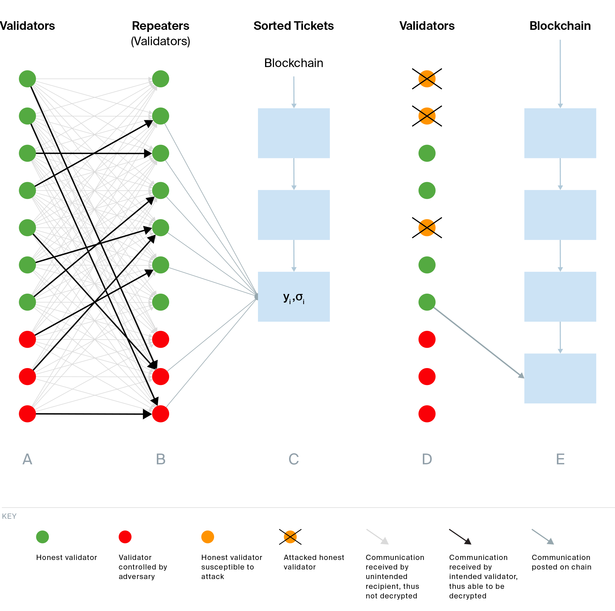 Phase D) When validator identities leak in Phase B, adversarial repeaters can decrypt their tickets (orange dots) and launch attacks (orange dots with a cross). The figure illustrates the worst-case scenario, in which all validators with leaked identities have been attacked. Even in this situation, the first honest validator on the sorted list (one who has not been attacked) is able to submit proof that they hold the winning ticket and become the next block producer.